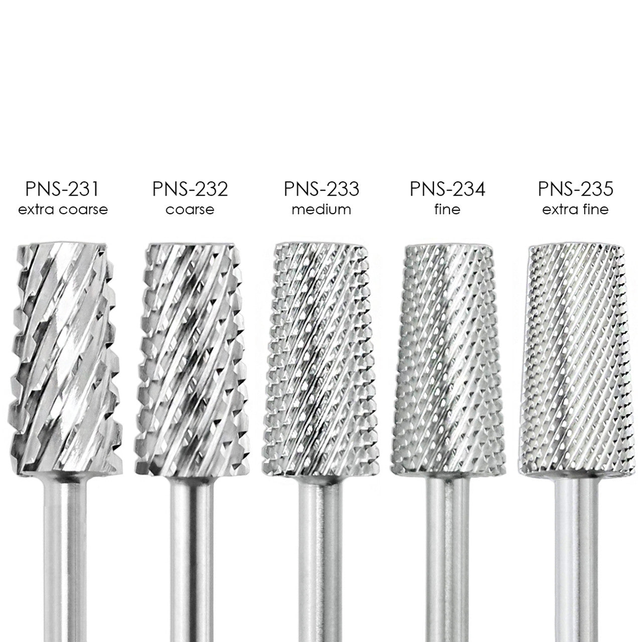 The PANA tapered drill bit includes are made with two different materials: tungsten carbide and ceramic coated drill bit. The tapered edge of the drill bit includes a finer grit at the tip of the bit to avoid any damages on the cuticle and surrounding nail wall and a coarser grit towards the base of the bit for general surface work such as backfilling, filing, smoothing, and shaping. The drill bits fits 3/32" shank and have 5 different grit sizes available (ranging from extra fine to extra coarse). This drill bit is suitable for nail techs who are working on artificial nails, the drill bit has many uses: from shaping, carving, smoothing, backfilling, and removing gel.