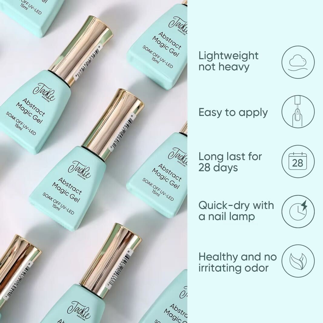 Jackie Signature's Abstract Magic Gel is a specialty nail art system designed to create a controllable blooming effect on the nail surface. It works in layers: the Magic Gel base, then the Magic Gel color, and finally the magic moment where you use a tool to reveal what’s underneath. The self-leveling formula continues to bloom as long as you let it.